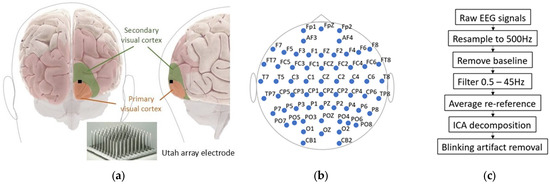 - Fernández, E.; Alfaro, A.; Soto-Sánchez, C.; Gonzalez-Lopez, P.; Lozano, A.M.; Peña, S.; Grima, M.D.; Rodil, A.; Gómez, B.; Chen, X.; et al. Visual percepts evoked with an intracortical 96-channel microelectrode array inserted in human occipital cortex. J. Clin. Investig. 2021, 131, e151331. [Google Scholar] [CrossRef]