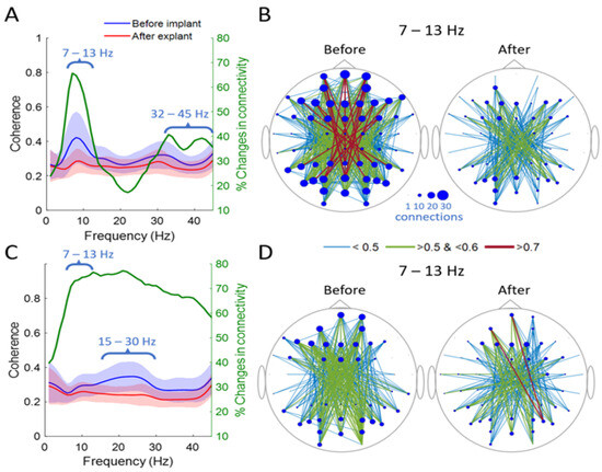Figure 2 shows the results of the analysis of global connectivity changes in the two users. This analysis is based on the average coherences between cortical positions separated by at least 10 cm. Before implantation, User 1 had an average coherence value of approximately 0.4 ± 0.15 in the 7–13 Hz band (solid blue line, Figure 2A), whereas after UEA explantation, coherence significantly decreased to an average of 0.28 ± 0.07. These values represent significant changes (p < 0.01) in approximately 65% of the analyzed connections (solid green line, Figure 2A), mainly observed in the frontal and occipital regions. Figure 2B shows, in general terms, a reduced number of nodal connections after UEA explantation compared to the reference state (before implantation). This is also observed in terms of the average coherence amplitude.