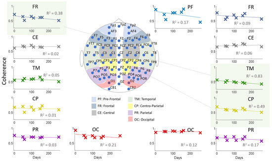 User 1. A longitudinal analysis of coherence in the 7–13 Hz band within predefined cortical regions: PF: Pre-frontal; FR: Frontal; CE: Central; TM: Temporal; CP: Centro-parietal; PR: Parietal; and OC: Occipital. Due to significant interference on some days, the average coherence in the left pre-frontal region (Fp1) is not represented in this figure. Coherence in the occipital region was determined between channels O1 and Oz for the left occipital region and between O2 and Oz for the right occipital region. The dotted lines in each graph represent linear trends obtained from a linear regression fit. R2 is the coefficient of determination resulting from that linear fit.