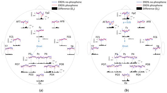 In Figure 2a, the EEG signal shows an increase in ERD in the 1–45 Hz range, primarily at FpZ, when the subject perceives a phosphene. The difference in ERD values between perception and non-perception was most pronounced between 500 and 1000 ms after stimulus onset. However, no significant differences were observed (p < 0.05). Significant differences between perception and non-perception were identified in the 4–7.5 Hz band at FpZ, approximately 600 ms after stimulus onset (Figure 2b). No significant differences were found in the remaining frequency bands.