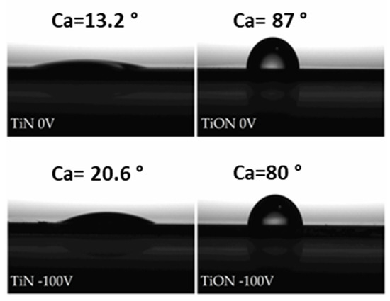 - Estrada-Martínez, J.; Reyes-Gasga, J.; García-García, R.; Vargas-Becerril, N.; Zapata-Torres, M.G.; Gallardo-Rivas, N.V.; Mendoza-Martínez, A.M.; Paramo-García, U. Wettability modification of the AISI 304 and 316 stainless steel and glass surfaces by titanium oxide and titanium nitride coating. Surf. Coat. Technol. 2017, 330, 61–70. [Google Scholar] [CrossRef]