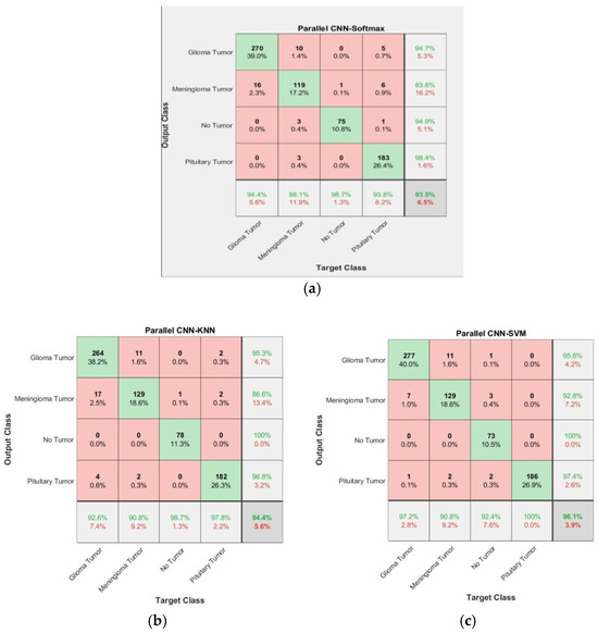 Confusion matrices: (a) parallel CNN-softmax, (b) parallel CNN-KNN, (c) parallel CNN-SVM.