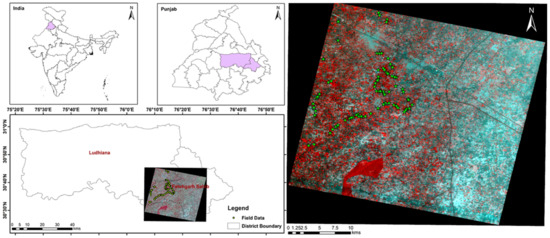 Punjab state is located in the northwest region of India. Punjab is predominantly an agrarian state which is highly dependent on river water for irrigation and domestic purposes in the non-monsoon period, and the main economic activity in the area is with chief crops such as wheat, rice, and cotton. This study area was selected for crop type study due to consisting of varying crop patterns, and the study was carried out over part of the Ludhiana, Fatehgarh Sahib, and Patiala districts of Punjab state, India, with an area that lies between 30°26′ N and 30°45′ N latitude and 76°06′ E and 76°28′ E longitude with a total area of ~890 km2 (Figure 1). The block lies in the study areas of Khanna, Amloh, Bassi, and Pathanan over Punjab state, India, and its primarily grown crops during the study period are maize, sunflower, moong, sugarcane, chilli, rice, etc.