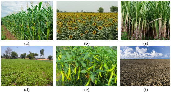 Field data collection is essential to identify the crop types present in a study area. Extensive field work was carried out during the paddy season (May and June months) to acquire the locations of crop types for the creation of a spectral library and classification. The geographical coordinates of each crop were measured using a handheld GPS with a position accuracy of +3 m. A total of 135 individual points were surveyed and the main agricultural crop types over the study area were maize, sunflower, moong, sugarcane, and chilli. Each collected field data point was accompanied with a photo record (Figure 2).
