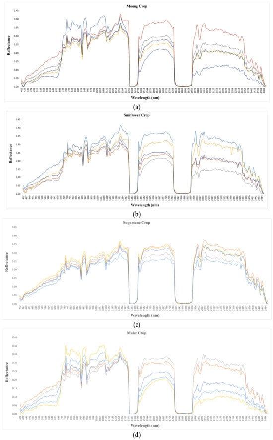 Remote-sensing-based crop type discrimination has gained importance for agricultural research. In situ crop type discrimination is frequently expensive, labour-intensive, and destructive. A large number of remote sensing sensors including multispectral optical sensors, microwave synthetic aperture radar, light detection and ranging (LiDAR), and hyperspectral sensors and techniques have been employed for the periodic assessment and monitoring of crops at different sites [2,3]. Such sensor dimensions control the type of detailed information that can be extracted from an image. Remote sensing data contain rich spectral features that characterize crop leaf pigment, leaf water content and canopy structure, and spatial features that reflect crop planting morphology and texture, particularly when high-spatial-resolution images are considered [4]. Multispectral sensors are limited in their ability to resolve agricultural crop types and can differentiate three to six classes of crop types with an overall accuracy of 60–75%. The improvements in remote sensing sensors in the studies of crop types have been significantly boosted with the launch of hyperspectral sensors with enhanced spatial and spectral resolution. Spectral resolution is more important than spatial resolution for providing accurate figures of species discrimination and the classification of crops. There are many difficulties linked with extracting valuable information with confidence from spatial resolution imagery. Hyperspectral imaging techniques have now been in use for over two decades and come as a reasonable and rapid mode for taking measurements of spectral reflectance. Very limited research has been performed on crop discrimination based on hyperspectral remote sensing sensors [5,6]. A precise and continuous spectral signature can significantly help obtain an unambiguous distinction among the crop types [7]. The spectral signatures reflected from the plant canopy at specific wavelengths provide various types of cumulative information on the substantial and gradual changes that occur in specific plant characteristics or tolerance levels [8]. Hyperspectral sensors with narrow spectral bands may be crucial for providing information of crop biophysical characteristics and yield prediction.