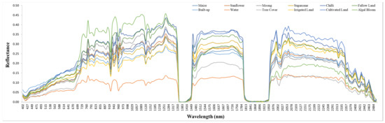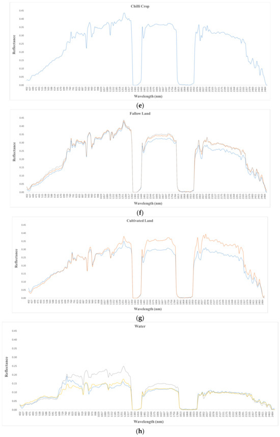 This research is mainly focused on the development of a crop spectral library, varying spectral responses, and the interpretation of spectral features using different indices. Field data were collected at the same time during the satellite imagery survey. During the ground survey, data of five different crop types (maize, moong, sugarcane, sunflower, and chilli) and six other features (fallow land, cultivated land, built-up land, tree cover, water, and algal bloom) were collected over 135 sites. Field data collection sites were selected by visual inspection of crop types and other features present in the hyperspectral imagery data covering the study area, and the reflectance of each crop and other feature types were collected. In this manner, 43 pieces of spectral information of five crop types and 38 pieces of spectral information of seven other features were obtained (Figure 3). The substrates’ reflectance was calculated as a ratio of the radiance from substrates against the downwelling irradiance. The collected end-member spectra of the same crop types at different sites over the study area were averaged to produce reference spectra for various specimens (Figure 4 and Figure 5). A number of collections of spectral signatures of each crop were made to ensure the homogeneity of crops. The main reason for using average spectra is that identical substrate types show variations in spectral reflectance in both magnitude and shape. The average spectral reflectance of each class was determined in a full optical spectral range from 402 to 2497 nm with 9.0 nm intervals. The sampling interval was 8.3 nm in the spectral range of 402 to 700 nm, while it was 9.1 nm in the spectral range of 701 to 2497. The spectral bands between 730 and 1295 nm were optimal in identifying maize crop, while three spectral bands between 402 and 719 nm, 1448 and 1533 nm, and 1949 and 2349 nm were used to identify rice crops. The discrimination of crop type is an important requirement for mapping and monitoring crops. Two major contributions in a crop’s reflectance spectrum are the leaf optical properties and the canopy structure. The narrowband spectral indices were significantly proven effective outcomes for crop pigment analysis.