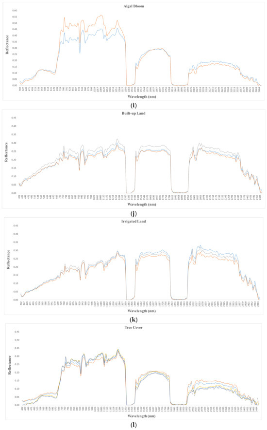 Spectral signatures of different crop types: (a) moong, (b) sunflower, (c) sugarcane, (d) maize, (e) chilli, (f) fallow land, (g) cultivated land, (h) water, (i) algal bloom, (j) built-up land, (k) irrigated land, and (l) tree cover.