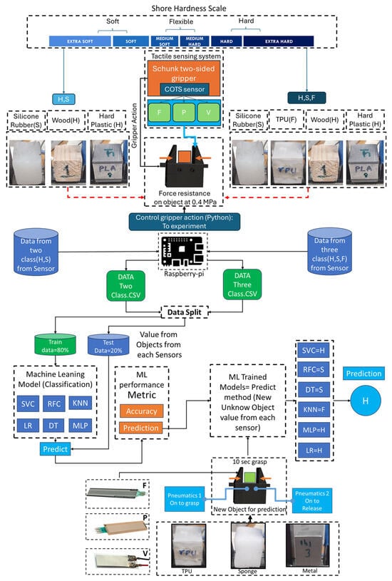 Determining the properties of objects or materials has always been crucial in manufacturing environments for handling purposes. Different types of classification have been performed across the literature using various customized, complex architecture-based sensors [,,]. These tactile sensors, however, have a high cost to produce and take more time to become ready to deploy in robotics environment [,,]. Additionally, customized sensors often face integration issues with robotic grippers. While different types of classification have demonstrated promising results in terms of accuracy, real-time prediction still misses the context of application use of sensors [,,,,]. However, one significant classification that has not been extensively explored is hardness classification. Hardness classification is essential in the industrial robotic environment. This helps to train robotic grippers to understand the hardness of objects, thereby enhancing the tactile sensing capabilities of robotic grippers. Different machine learning algorithms have been used across literature to analyze collected data and use accuracy metrics to evaluate performance but do not explore real-time testing or the prediction capability outcome of classification [,].
