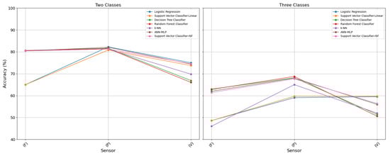 This figure illustrates the accuracy results obtained from each algorithm for the sensors considered across multiple algorithms: F—force sensors; P—potentiometer sensors; V—vibration sensors. The left plot shows the accuracy based on two classes (hard and soft), while the right plot presents the accuracy based on three classes (hard, soft, and flexible).