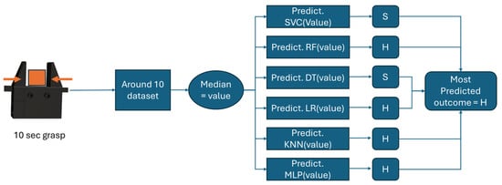 The figure showcases the prediction approach employed, highlighting the outcomes from several algorithms. The process begins with the grasping of the object for approximately 10 sec to collect data, followed by calculating the median value. This median value is then input into the prediction methods of each algorithm, with the most predicted outcome being displayed.