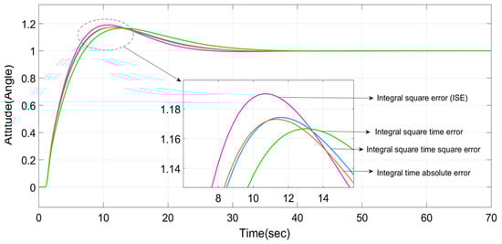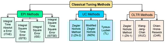 Classical PID controllers are normally used in many industrial applications due to their simplicity in structure and ease of design. They are designed by using various classical PID tuning methods, namely the error performance indices (EPI), open loop transient response (OLTR), and ultimate cycle (UC) methods, as depicted in Figure 3. The corresponding coefficients (KP, KI, and KD) of the PID module that are calculated using the above-said methods are displayed in Table 1. The OLTR and EPI methods are PI controller-tuning methods as they provide only proportional and integral gain parameters. UC is a PID controller-tuning method as it provides all proportional, integral, and derivative parameters.
