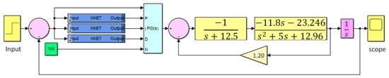 In neural networks, there are three methods for controller design: (i) the Levenberg–Marquardt (LM) algorithm, (ii) the Bayesian Regularization (BR) algorithm, and (iii) the Scaled Conjugate Gradient (SCG) algorithm. The LM algorithm works on the principle of the least squares, which is also called the damped least square method. It is a commonly used method for solving nonlinear systems. This method is mainly used for small and medium-sized systems in ANNs. The BR algorithm is derived from the Bayes theorem. In this method, the nonlinear regression relations are converted into second-order linear regression-based mathematical equations. The SCG algorithm uses a linear search in each iteration. This method is mainly used for solving linear systems. This algorithm works with feedforward ANNs. These methods solve when all the errors are in the region of assumed values. The Simulink model of the ANN-PID-based system is shown in Figure 7.