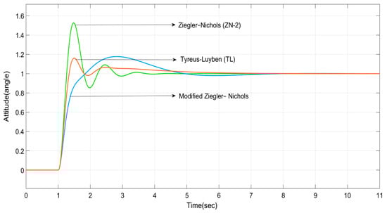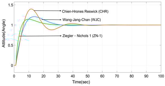 The transient responses of the classical PID controller-tuning methods are shown in Figure 8, Figure 9 and Figure 10. From these plots of the classical PID controller, it is experiential that the OLTR (Figure 8) and EPI (Figure 9) methods have longer settling times of around 20–40 s, while UC methods (Figure 10) have lesser settling times of around 2–4 s.