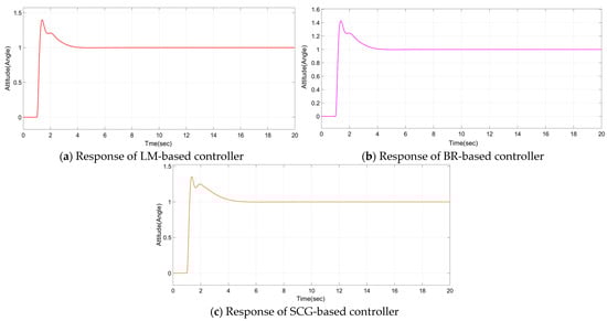 The time-domain performance indexes are shown in Table 2. From these indexes, this tuning method, which leads to lower values of these indices, is considered the best tuning method. From this table, it is found that the TL method of classical PID design leads to superior values when matched to other methods. Thus, the TL method is declared as the best method for the controller design among the group of classical PID tuning methods. The transient responses of the ANN-PID controller trained with LM, BR, and SCG algorithms are shown in Figure 11. Their performance index is consolidated in Table 3. From this table, it is determined that the BR algorithm is the best ANN-based PID tuning method, as it shows the superior index values.