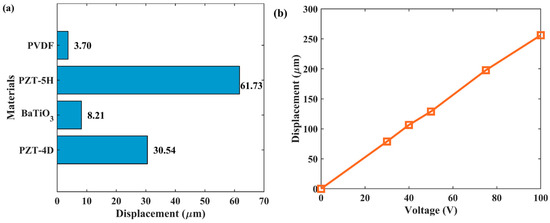 - Adhikari, J.; Kumar, R.; Narain, V.; Jain, S.C. Effect of Poling Orientation in Performance of Piezoelectric Materials. In Machines, Mechanism and Robotics: Proceedings of iNaCoMM 2019; Springer: Berlin/Heidelberg, Germany, 2022; pp. 1721–1732. [Google Scholar]