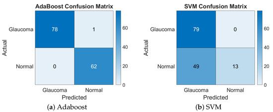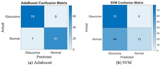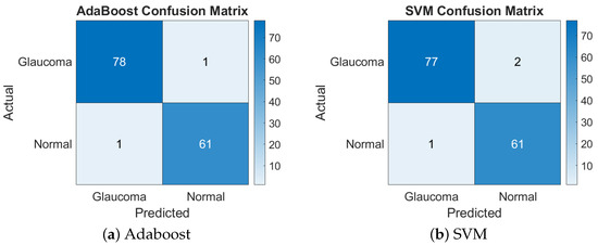 This feature combination achieved a balanced performance with both classifiers, resulting in a 98.58% accuracy with AdaBoost and a 97.87% accuracy with SVM. The similarity in performance suggests that these features provided a well-structured representation of the image data that both classifiers could handle effectively. Figure 4 presents the confusion matrices for the GLCM + LBP features combination.