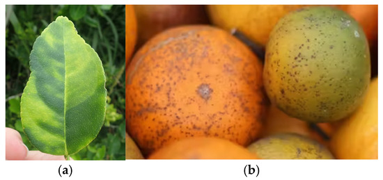 (a) Leaf of a citrus plant infected with Huanglongbing (HLB) disease; (b) Citrus fruits infected with Huanglongbing (HLB) disease.