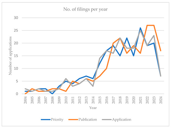 Number of filings over the past twenty years. In this figure, the priority, application and publication year are indicated.