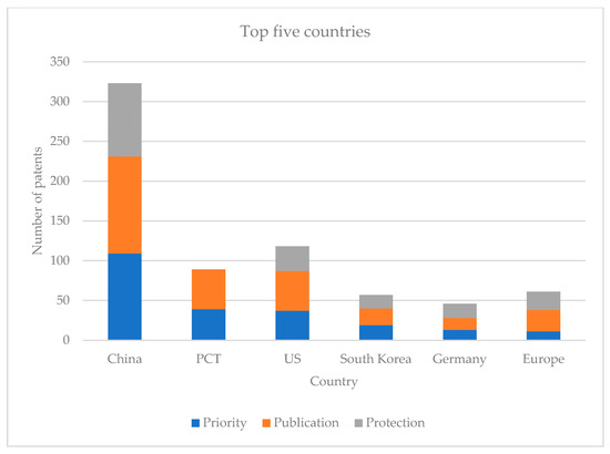 Figure 2 illustrates the five countries with the highest number of filed and published applications. China leads the ranking, with 109 priority applications, followed by the USA (37) and South Korea (19). Notably, the PCT procedure is a popular choice among applicants, with 39 applications.