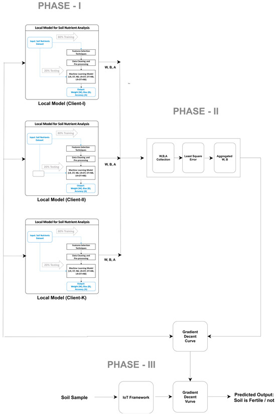 The proposed model shown in Figure 1 has three phases, of which Phase I comprises the local model and its training using its dataset at individual client systems. Phase II is applies a set of techniques to improve the accuracy of the server-end model. Further, Phase III focuses on verifying the centralized model with sample data collection using a sensory system. Figure 1 shows a detailed explanation of the working process of each local model. It represents the training of a machine learning model using a nutrient dataset to identify whether the soil is fertile or not.