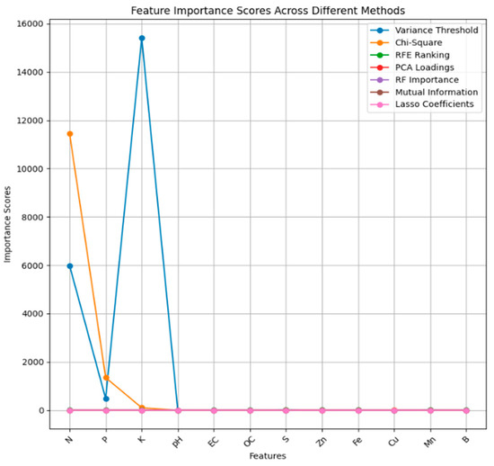 In addition, we tried to represent the importance scores in the chart in Figure 3, which describes the importance scores of different techniques. It shows how each feature ranks according to the different feature selection techniques.