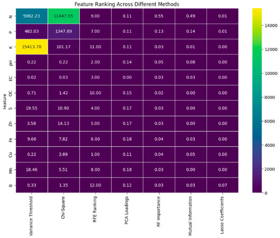 Further, the heat map generated and shown in Figure 4 implemented a multiple feature selection method to visualize the ranking of different features of our dataset. It compared all the results of the feature selection techniques and identified the most important features for our predictive model. Here, it showed that the soil nutrient properties were very important. Potassium is identified as a key factor for analysis, and based on cross validation, the ranking of nitrogen is high. Overall, by focusing on the soil properties, the prediction model can be optimized.