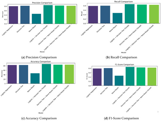Figure 5 shows a comparative analysis using a bar chart based on precision, recall accuracy, and F1-score. It was observed that the naïve Bayes had low performance in each metric, whereas the ensemble of logistic regression with the decision tree had higher performance.