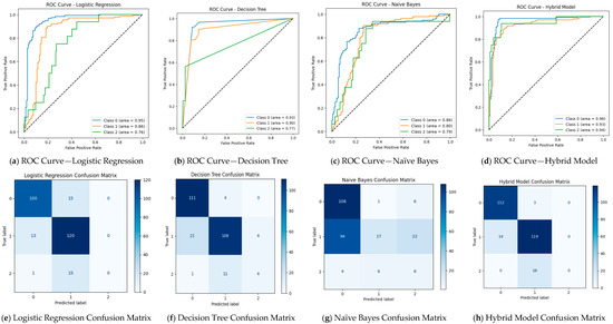 Figure 7 represents the ROC curve and confusion matrices of individual methods along with the hybrid approach.