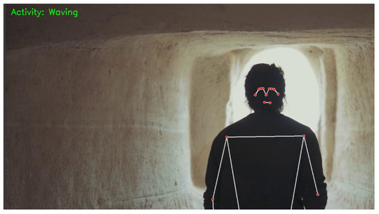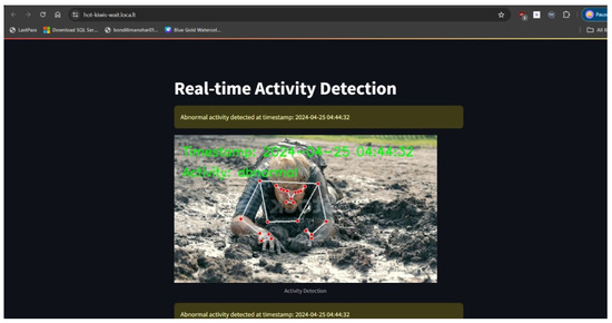 The proposed work utilizes OpenCV and MediaPipe machine learning frameworks for real-time activity recognition through human pose estimation. It processes video frames to detect key pose landmarks, focusing on the left shoulder, elbow, and wrist. By calculating the angle between these landmarks, the system classifies activities as “Crawling” for angles below −120 or above 120 degrees which is observed in Figure 4. The activity “Walking” when the angle is between −45 and 45 degrees is observed in Figure 5. Any angles falling outside these specified ranges are categorized as “Abnormal”, indicating that the detected movement does not match predefined activity patterns. The system displays pose landmarks with connected skeletal structures and the identified activity on each frame, demonstrating its effectiveness for applications in sports analytics, physical therapy, and interactive systems. The real-time activity analyzed on the system is shown in Figure 6.