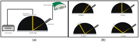A 3D-printed semi-circular casing was built to enclose the LED and the photodiode. Holes were drilled in the respective angles for which the source and detector can be adjusted to vary the detection angle. Also, the 3D-printed casing was painted black to reduce the effect of the unnecessary noise from the environment. Figure 2 below shows the simplified illustration of the experimental setup.