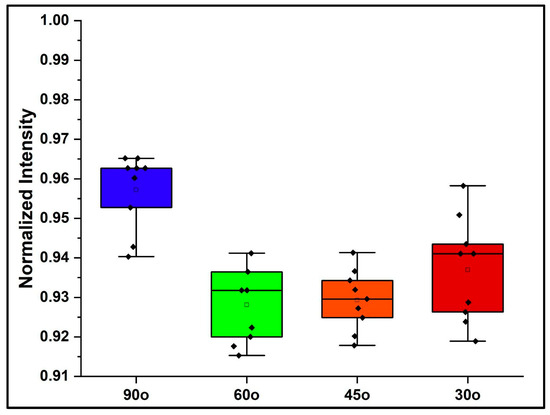 The box plot in Figure 4 provides normalized intensity values on the y-axis, with four different angles (90°, 60°, 45°, 30°) on the x-axis. The mean normalized intensity of the detection angles is 0.96, 0.93, 0.925, and 0.94, respectively. The three detection angles, namely 90°, 60°, and 30°, show that data are skewed to the left of the distribution. On the other hand, the 45°detection angle shows normally distributed data. Based on the above box plot, the 45° detection angle shows a better data distribution. Also, the four datasets show non-outlier points, suggesting that the S1133 photodiode detector has a good response and consistent behavior to the white LED source within the experiment.