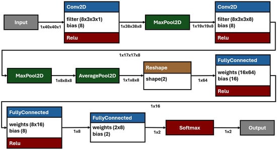 The neural network architecture, as shown in Figure 6, is built using a sequential model. The input to the network consists of a 2D array of 40 × 40 × 1 representing audio features. The first layer is 2D convolutional layer which has 8 filters, 3 × 3 in size. The filters are constrained using max-norm regularization with a maximum norm of 1. The ReLU activation function is used in this layer. After this, a max pooling layer with a pool size of 2 × 2 and a stride 2 is applied. Another 2D convolutional layer having 8 filters, 3 × 3 in size, is applied. A ‘valid’ padding, max-norm constraint, and ReLU activation are added to capture more complex features in this layer. Another similar max pooling layer follows the second convolutional layer. A dropout layer with a rate of 0.25 is included after the pooling layers to prevent overfitting. An average pooling layer with a dynamically determined pool size is used to aggregate features spatially before flattening. A reshape layer converts the 2D pooled feature maps into a 1D vector, preparing them for the fully connected layers. A fully connected layer having 16 neurons and ReLU activation is used, with L1 regularization to encourage sparsity in the learned weights. A second fully connected layer with 8 neurons and ReLU activation is added, also with L1 regularization and a dropout layer. The final fully connected layer has 2 neurons, representing the number of classes, with a softmax activation function to provide class probabilities.