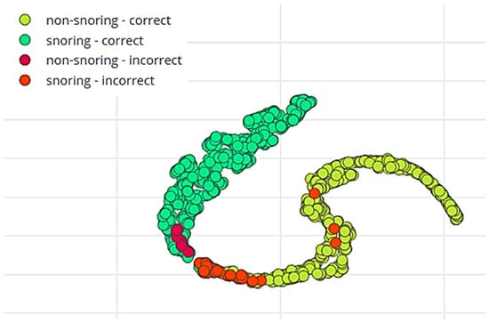 The study in [] presents a novel snore detection algorithm which uses convolutional recurrent neural networks. The model is evaluated on audio data from 38 users while they slept. The system uses microphones installed in different places, and the algorithm achieved high accuracy (95.3%) in detecting snore events, with 92.2% sensitivity and 97.7% specificity. The performance of the algorithm remained robust across different microphone positions, which indicates the reliability of the system for snore detection in different sleep environments. Another study [], focuses on the crucial need for a reliable snoring detection system for monitoring and diagnosing obstructive sleep apnea (OSA) to improve the quality of life for those with the disorder. This research proposes a hybrid convolutional neural network (CNN) model for detecting snores. In OSA monitoring in real-world situations, the model achieved an 89.3% average classification accuracy, 89.7% sensitivity, and 88.5% specificity. The research in [] discusses the health hazards associated with obstructive sleep apnea hypopnea syndrome (OSAHS) and suggests a novel strategy for monitoring and identification to avoid treatment delays. The system classifies the snoring voices of normal individuals and those with OSAHS. Mel-frequency cepstral coefficients (MFCCs) are used in the study, along with CNN and LSTM models for feature extraction. The method has the greatest accuracy rate of 87% for binary categorization of snoring data. The suggested approach can also estimate the severity of OSAHS using the determined AHI value, providing useful information for clinical diagnosis and therapy. In [], the authors discuss the challenges of detecting OSAHS by developing a snore detection system that enables at-home screening. The study suggests an approach for utilizing the hardware limitation of smartphones. The developed system detects snoring and environmental noises with using a real-time snore detector (RTSD) for sleep sound recordings. The RTSD serves as a valuable standalone tool for analyzing quality of sleep.