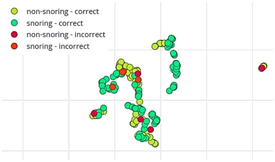 The trained model is evaluated on a test dataset. The accuracy of the model, as well as the memory it takes and its processing speed, is also tested on resource-constrained IoT devices. The confusion matrix for the test dataset is shown in Table 4. For non-snoring predictions, the model correctly classified 96.8% of non-snoring instances as non-snoring and incorrectly classified 1.1% of non-snoring instances as snoring. It also classified 2.1% of non-snoring instances as uncertain, indicating that the model could not confidently classify the instance as either snoring or non-snoring. Similarly, the model correctly classified 96.4% of snoring instances as snoring and incorrectly classified 0.5% of snoring instances as non-snoring. It also classified 3.1% of snoring instances as uncertain. F1 scores are measures of the accuracy of the model, and the F1 scores for ‘non-Snoring’ and ‘snoring’ voices were 0.98, which indicates that the model achieved high accuracy in classifying both classes in new data. The graph in Figure 8 shows the model performance on the test dataset.