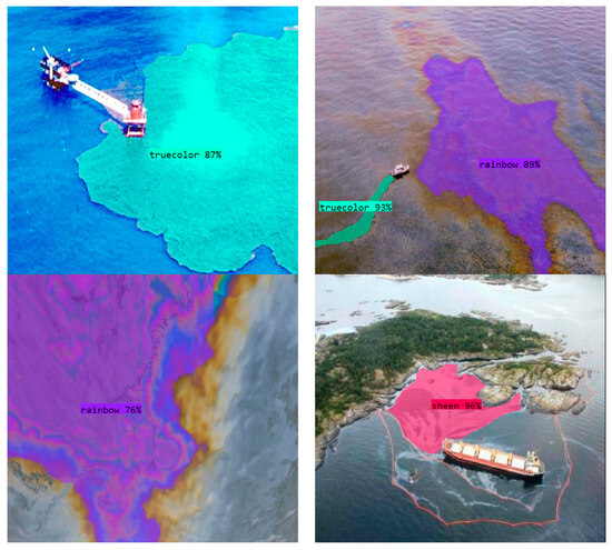 The segmentation appears to be reasonably accurate in most areas, capturing the majority of the oil spills. The images in Figure 6 showcase the results of instance segmentation applied to detecting oil spills and classifying their thickness levels using the Bonn Agreement Oil Appearance Code (BAOAC) [21,22]. The different classes indicate the oil spill thickness, which is categorized into types such as “rainbow”, “sheen”, and “truecolor”, each representing a specific thickness level based on visual appearance. The purple areas with labels such as “rainbow 76%” or “rainbow 60%” depict thin oil films on water. The rainbow effect occurs due to light interference on the thin oil layer. The red-colored regions marked as “sheen 96%” or “sheen 74%” refer to very thin layers of oil that appear transparent or with minimal color. The high percentage indicates the model’s confidence in identifying this class. The predicted green areas, such as “truecolor 99%” or “truecolor 94%”, represent thicker oil layers where the oil color dominates, which are typically seen in spills where the oil forms a more opaque film.
