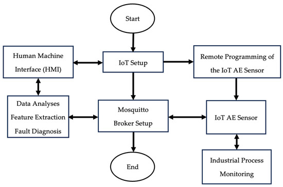 After configuring these parameters, two key actions take place: (i) the parameters are sent for remote sensor configuration, and (ii) the MQTT server (broker) is set up and activated for cloud integration. At this point, the system establishes an active data link with the AE sensor, enabling the acquisition of signal samples when process events occur. Based on these events, specific data analysis, feature extraction, and fault diagnosis algorithms can operate, informing the operator if any action is required or automatically adjusting machine parameters to control the process.
