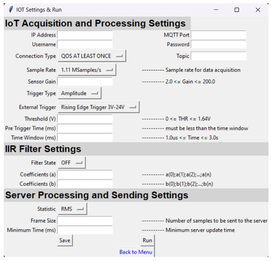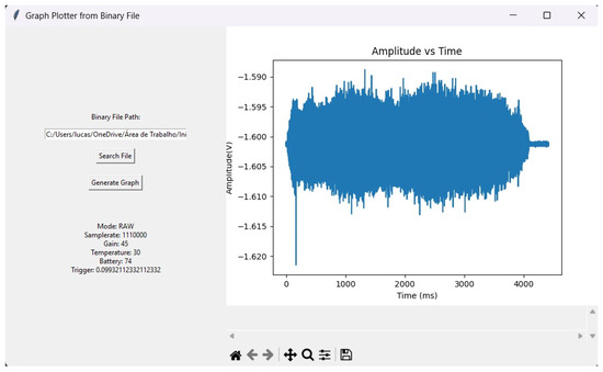 For the IoT integration software, Python was used to develop a graphical user interface (GUI) via the Tkinter library. This interface allows for the adjustment of various parameters that vary according to the experiment being conducted, such as the gain, sampling rate, digital filter parameters, and the number of samples in the generated data file.