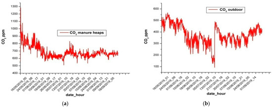 Time series of the CO2 concentration measured very close to the manure heaps (a), and outside the depot (b).