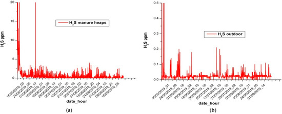 Time series of H2S concentration measured very close to the manure heaps (a), and outside the depot (b).