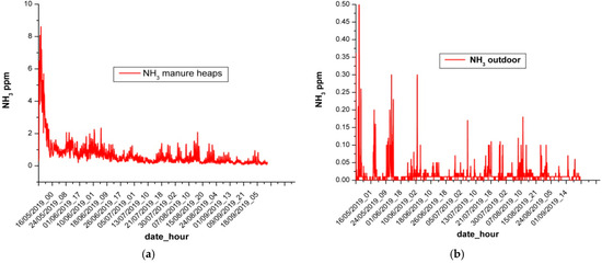 Time series of NH3 concentration measured very close to the manure heaps (a), and outside the depot (b).