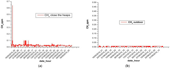 Time series of CH4 concentration measured very close to the manure heaps (a), and outside the depot (b).