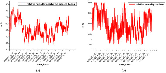 Time series of the relative humidity measured very close to the manure heaps (a), and outside the depot (b).