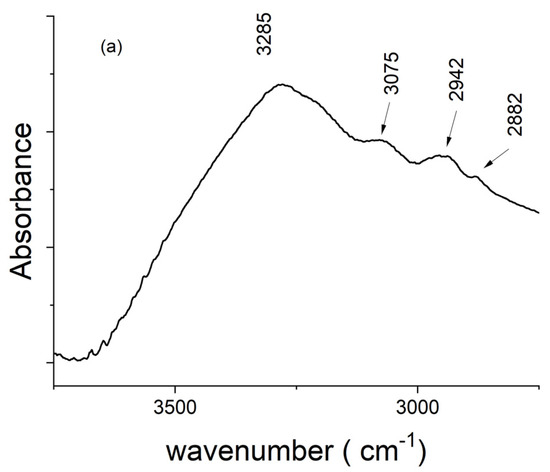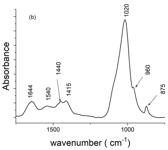 In Figure 1, the average spectra collected from the dentin powder samples are reported in the two panels (a) and (b), related to the high-wavenumber spectral range (3700–2000 cm−1) and the fingerprint region (1800–800 cm−1), respectively. Different contributions from the organic and inorganic dentin components are evident. The positions and the attributions of the most relevant peaks are reported in Table 1.