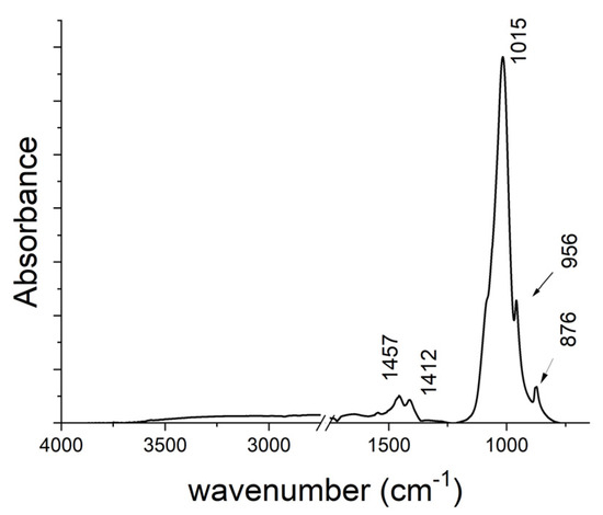 FT-IR spectra of the powder samples were obtained by using a small amount of the samples and the Universal ATR (Attenuated Total Reflectance) accessory of a Perkin Elmer Spectrum One spectrometer (Perkin, Shelton, CT, USA), equipped with an MIR TGS detector. The spectra were acquired using 64 scans in the range of 4000 to 650 cm−1, with a 4 cm−1 spectral resolution.