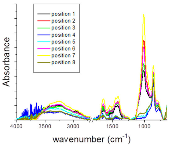 In Figure 3, the FT-IR spectra acquired from different regions of the human molar disks are reported. In this case, the use of the germanium IRE allows the characterization of small areas of the samples with a spatial resolution of tens of μm2. In this way, the changes induced in the chemical composition of small areas of the teeth by treatments with physical and chemical external agents can be easily investigated [7,8,9,10,11].
