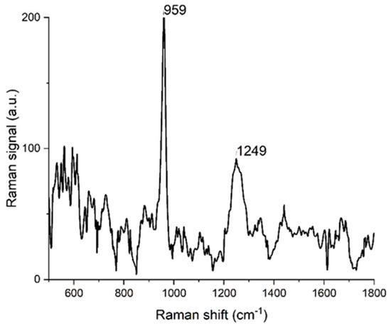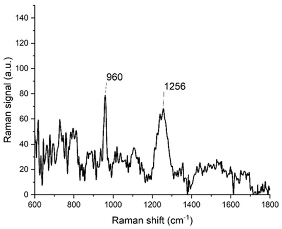 A representative spectrum collected from the dentin powder samples, reported for the 600–1800 cm−1 spectral region, is shown in Figure 4. Some contributions from organic and inorganic dentin components are evident. In Figure 5, a representative spectrum collected from the enamel powder samples is reported, showing a peculiar relative intensity of the observed peaks. The main Raman peaks of enamel and dentin powder reported in the literature are listed in Table 2.