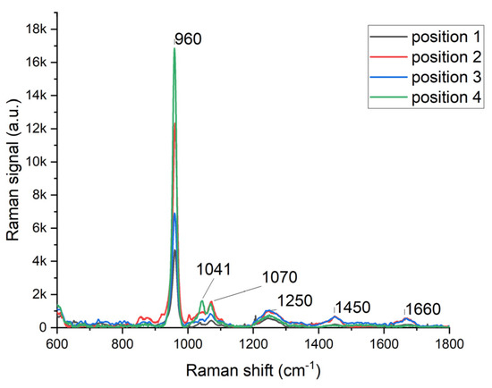 Some Raman spectra obtained from different positions on the molar disk samples are shown in Figure 6. Contributions of the two main components of the teeth can be observed, with the relative intensities of the various peaks being highly dependent on the investigated positions. This confirms the ability of Raman spectroscopy to investigate tooth samples. In addition, taking advantage of the higher spatial resolution offered by this technique, it is possible to investigate micrometric regions. The Raman spectra reported in Figure 4, Figure 5 and Figure 6 allow the identification of different spectral contributions, even though they have been preliminarily obtained from the raw data by simply subtracting the fluorescence background signals that are generally present when biological samples are examined. It is well known that the quality of Raman spectra can be significantly improved by applying noise reduction algorithms (see Ref. [16] and the references therein).