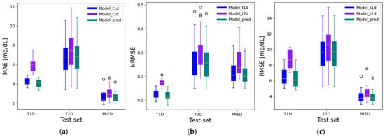 Figure 1 illustrates the box-plots of all model metrics when tested on the three different datasets. The results corroborate those found in Table 1, showing the lowest values of the MAE and RMSE metrics for the prediabetic population, while NRSME presents a lower value for the T1D dataset. Analyzing the graphs, we observe the large dispersion of errors for the T2D dataset, which is likely due to its large number of subjects.