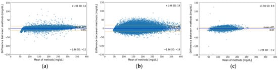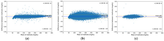 Bland–Altman plots of Model_t2d on three test sets. (a) T1D, (b) T2D, and (c) PRED.