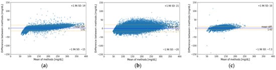 Bland–Altman plots of Model_t1d on three test sets. (a) T1D, (b) T2D, and (c) PRED.